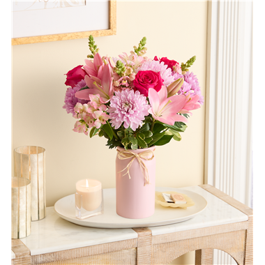 Thank Mom for a lifetime of comforting hugs with our Mother’s Embrace™ bouquet. Lovely pink and lavender blooms are hand-designed in a pink ceramic vase, creating a heartfelt expression of your feelings whether you're celebrating Mother’s Day together or sending a smile from miles away.